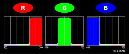 私たちの眼の中にある網膜には、長波長(赤)、中波長(緑)、短波長(青)、のそれぞれの光に反応する3種類の錐状体細胞があるためにさまざまな色を感じることができます。