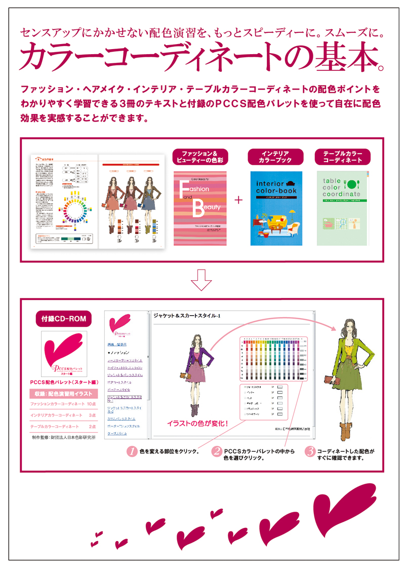 ファッション、インテリア、テーブルのカラーコーディネートの基礎を学ぶことができる3冊のテキストと、パソコンの画面で配色演習ができるソフトがセットになった色彩学習教材です。